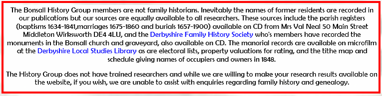 Bonsall has a long history of lead mining, possibly going back to Roman times, and is mentioned in the Domesday Book. Bonsall inhabitants have been involved in the textile industry, pre- and post-Arkwright. In early modern times it was on an important salters' route, and was a staging post on the road between Derby and Manchester. Bonsall is still a working village, involved in agriculture, heavy goods transport and home to approximately 70 small businesses of different types.